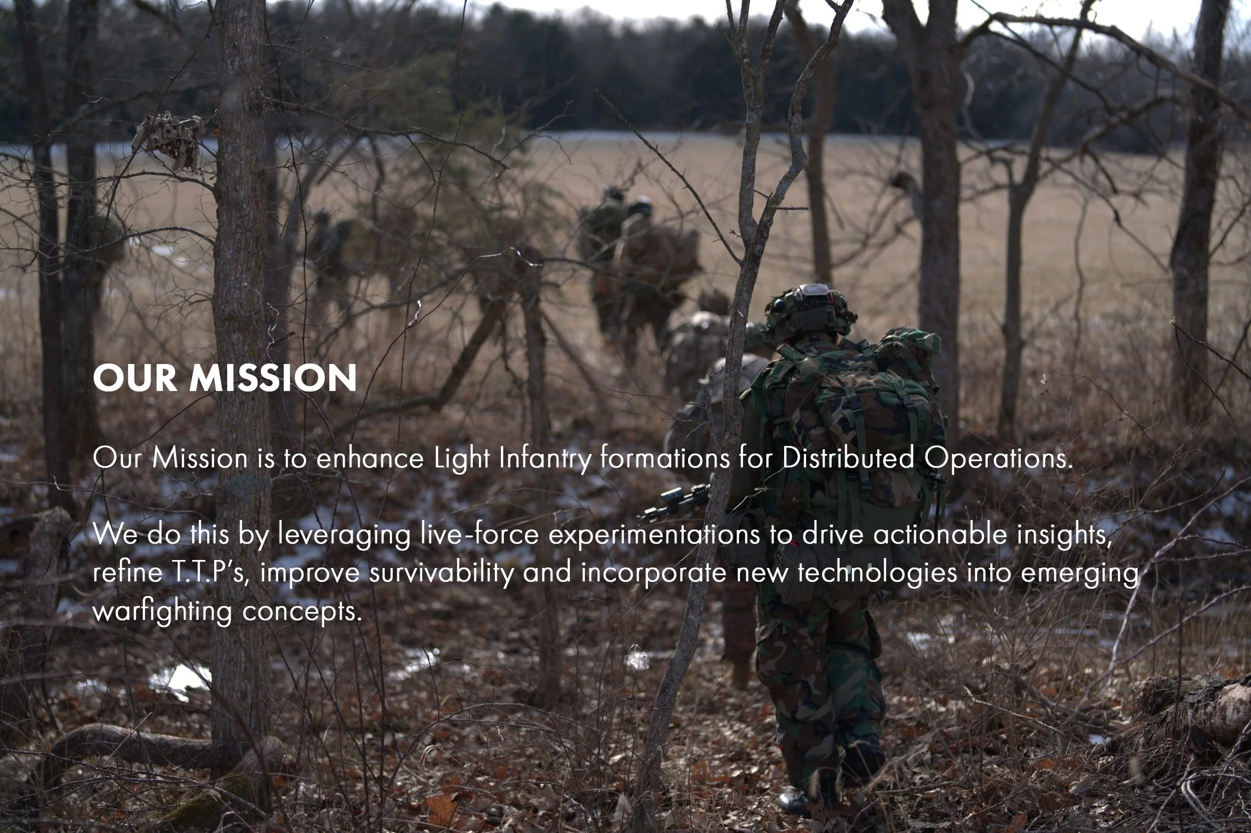 We are proud to collaborate with U.S. military professionals, defense researchers, and capability/material developers to explore and implement solutions that address the emergent challenges faced by light infantry units today and in the future.